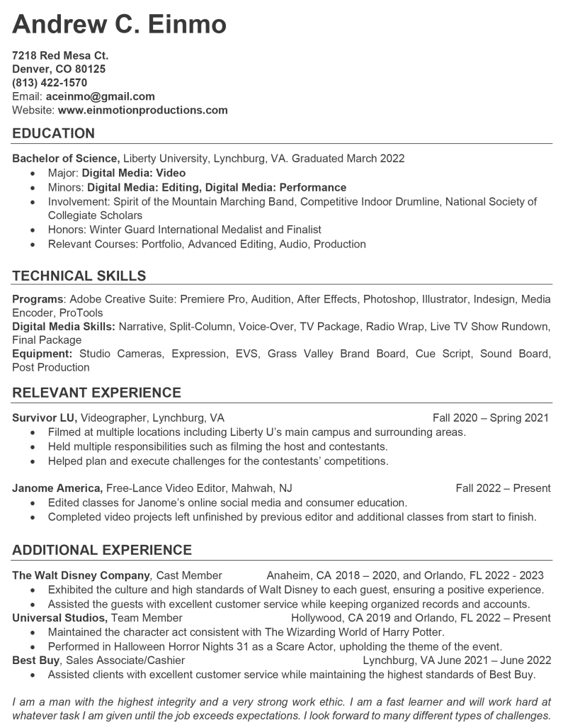 I have worked in several locations throughout my life. Right out of High School I worked at the popular movie theatre chain Regal Cinemas as a food service worker, assisting guests to the best of my abilities. This experience helped me achieve other Food Service positions at Disneyland Resort and Walt Disney World Universal Studios: Hollywood/Orlando
